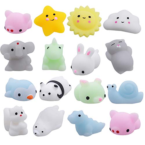 Squishy Mochi: Anatroccolo Giallo, Coniglio Pasquale Bianco e Rosa, Coniglio Blu e Rosa, Tartaruga Verde, Anatra Gialla, Pollo Giallo, Uccello Angry Giallo, Gatto Grigio e Piccolo Dinosauro.