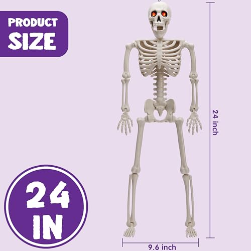 JOYIN Scheletro di Halloween da 24 pollici Ossa di plastica umane per tutto il corpo con occhi luminosi a LED e giunti snodabili per la decorazione di case infestate o cimiteri Il nostro scheletro di Halloween con occhi luminosi a LED rossi misura 24 pollici e produce un suono stridulo inquietante.