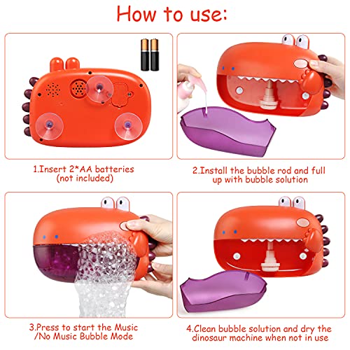 Premere tre volte per fermare le bolle. Il giocattolo da bagno con bolle di dinosauro è un oggetto magico che rende il bagnetto più interessante, attirerà naturalmente l'attenzione del tuo bambino. Con questa simpatica macchina per bolle, il tuo bambino godrà di un meraviglioso bagno felice.