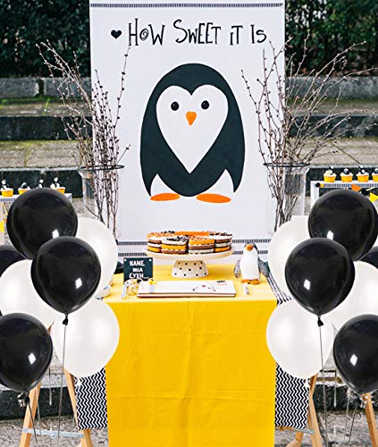 Set di forniture per feste del pinguino: ci sono 1 banner di buon compleanno, 2 palloncini di lamina di pinguino ambulante (20,5 pollici), 1 topper glitter "Happy Birthday", 24 topper di torta di pinguino, 20 palloncini di lattice (10 neri, 10 bianchi).
