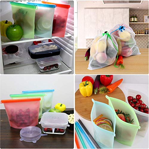 Joyoldelf 14 Pezzi Sacchetti in Silicone - 4 Pezzi Sacchetti Riutilizzabili in Silicone per Alimenti, 6 Pezzi Coperchio in Silicone Estensibile, 4 Pezzi Sacchetti Frutta e Verdura Riutilizzabili