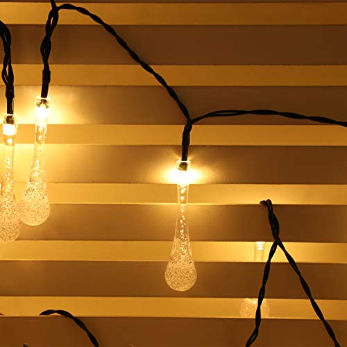 [2 Modalità di Illuminazione per Creare Vari Ambienti]: Luci stringa solari, luce stringa solare gocce d'acqua, catene luminose da giardino a energia solare ha 2 diverse modalità di illuminazione che possono essere regolate dal pulsante "modalità" dietro il pannello solare. Le lucine da giardino a energia solare, palla di luce a goccia bianco caldo sono costituite da 50 LED con coperture a goccia di cristallo esposte al sole e accese automaticamente di notte