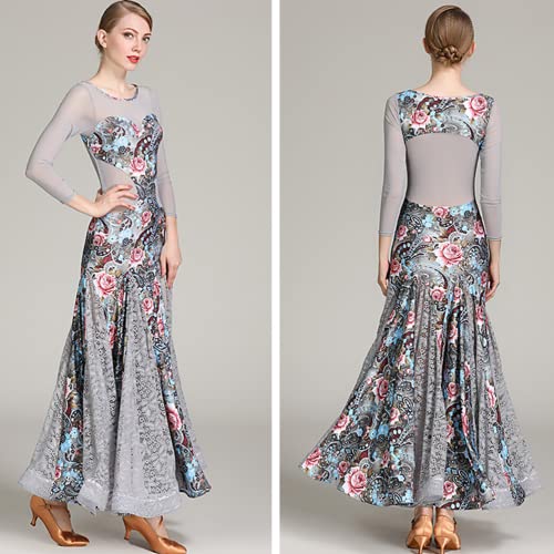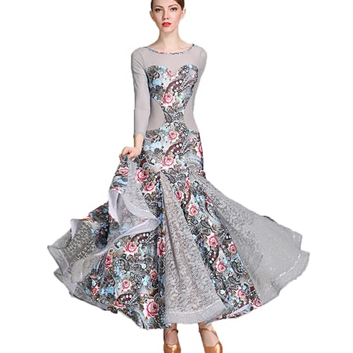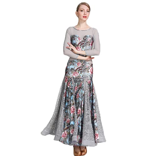 JRUIA Abito da Ballo Moderno in Pizzo da Tango Abiti da Ballo Standard Traspiranti A Maniche Lunghe Vestito da Ballo per Feste da Donna Costumi per Esercizi di Valzer,Grigio,L
