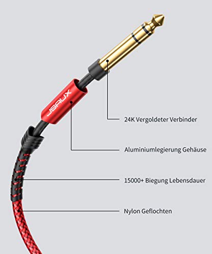 JSAUX Cavo per Chitarra 3M (10ft), 1/4" 6.35mm a 6.35mm TRS Cavo Audio Stereo per Chitarra con Jack Intrecciato in Nylon per Chitarra Elettrica, Basso, Amplificatore, Tastiera, Mandolino - Rosso