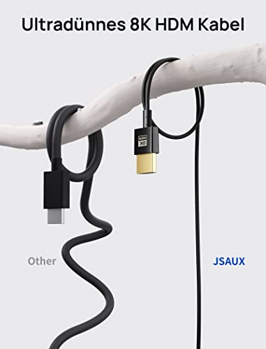 Vantaggi del cavo super sottile HDMI 2.8 mm: il cavo HDMI 2.1 JSAUX ultra sottile ha un diametro esterno di soli 2,8 mm, che è più del doppio più sottile rispetto ad altri normali cavi HDMI. Ciò significa che non devi preoccuparti dei disagi causati dal cavo HDMI pesante.