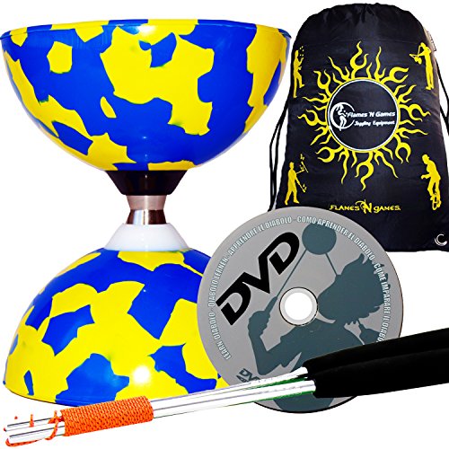 Juggle Dream Jester PRO Diabolo con Cuscinetto a Sfere Set + Bacchette di Alluminio, Cordino, Dvd & Diablo Borsa da Viaggio! (Blu/Giallo + Bacchetta Argente)