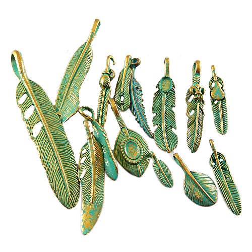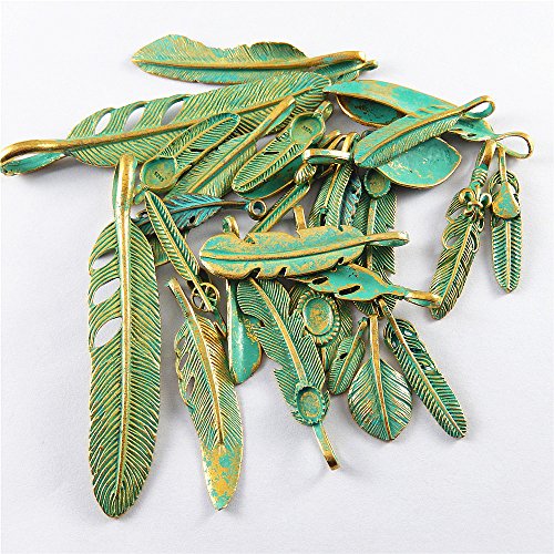 JulieWang, 28 perline e ciondoli misti color bronzo anticato e argento, a forma di piuma, per creazione di gioielli