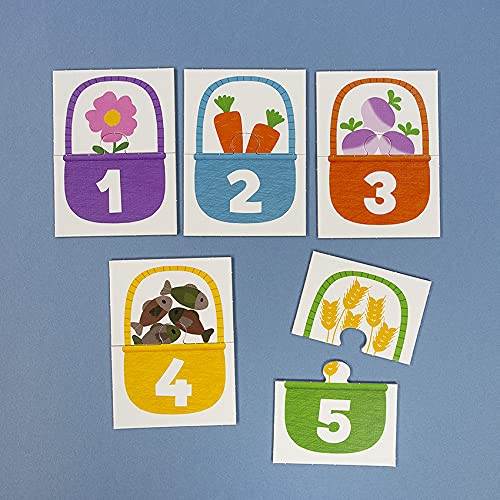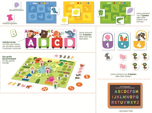 Contenuto: 5 grandi biglietti della lotteria, 30 piccoli biglietti della lotteria, 26 puzzle con lettere, 5 puzzle numerici, 1 campo da gioco con carte animali e tessere animali, 4 personaggi da gioco, 5 tessere di dadi, lavagna dell'alfabeto