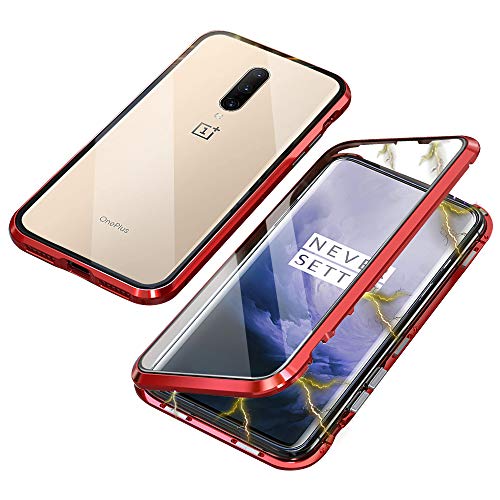 JUNHENG Custodia per OnePlus 7 Pro Adsorbimento magnetico Tech Metallo Flip Cover Doppio Vetro temperato Design Magneti potenti Cornice incorporata Protezione 360 gradi Antiurto Cassa, Rosso