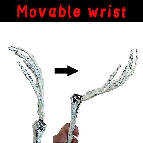 Fornitura: il set di ossa di Halloween comprende 1 * testa di teschio (la mascella superiore e inferiore si possono muovere), 2 * pendolo per il polso (il polso e l'angolo di appoggio sono regolabili).