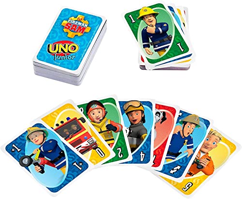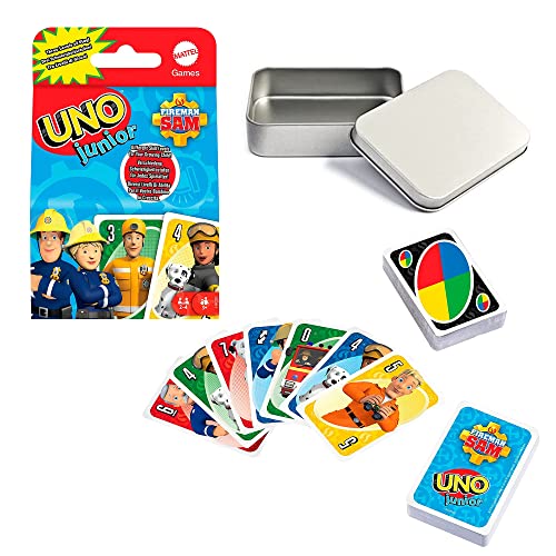 UNO Junior Gioco di carte nuova edizione per bambini, giochi per bambini, adatto per 2 - 4 giocatori dai 3 anni in su, scatola di metallo per collezione di giochi... (UNO Junior Fireman Sam + scatola