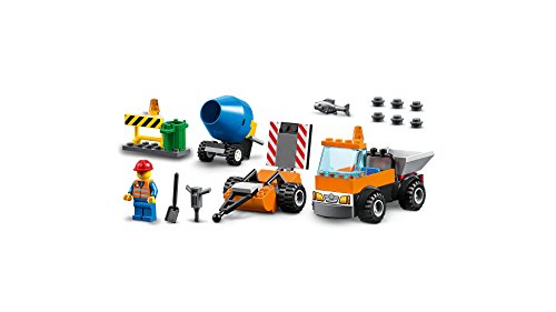Gli accessori includono un martello pneumatico, una pala, un bidone della spazzatura, una barriera e sei elementi di cemento
