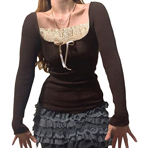 Junliber Camicia da donna Y2K con colletto quadrato patchwork a maniche lunghe Top vintage Estetica camicetta Tee Fairycore Grunge Streetwear, taglia unica, Colore: marrone., S