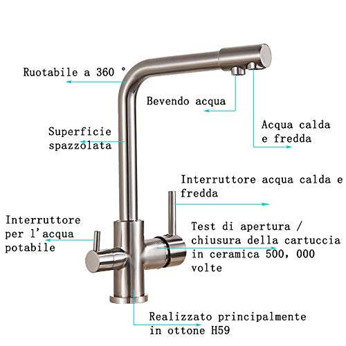 JUNSHENG 3 Vie Rubinetto da Cucina Rubinetto Girevole a 360 ° Acqua Fredda e Calda Rubinetto Lavello Cucina Miscelatore per Acqua Filtro Rubinetto da Cucina 3 in 1 - Nichel Spazzolato(ottone)...