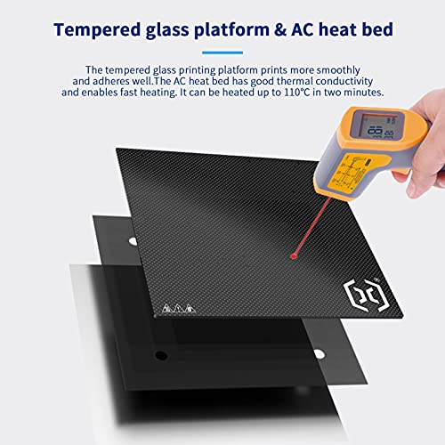 [Fast Heating Platform & Intelligent Auto Leveling] The tempered printing platform prints more smoothly and adheres well. The AC heat bed has good thermal conductivity and enables fast heating. It can be heated up to 110°C in two minutes. With matrix automatic bed leveling, intelligence, precise testing, the device supports dynamic leveling compensation.