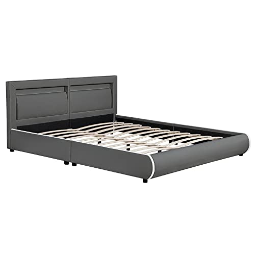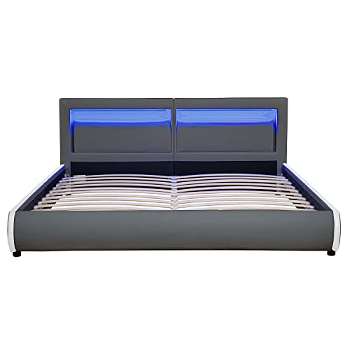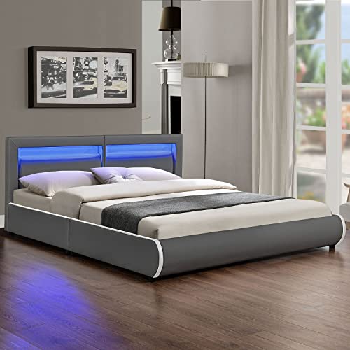 Juskys letto imbottito Murcia da 180x200 cm Letto con LED, rete a doghe, testata e similpelle Letto imbottito, accogliente e moderno - Grigio scuro