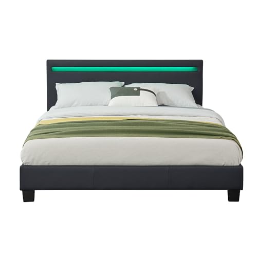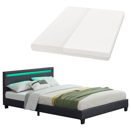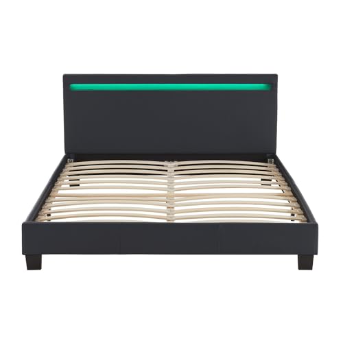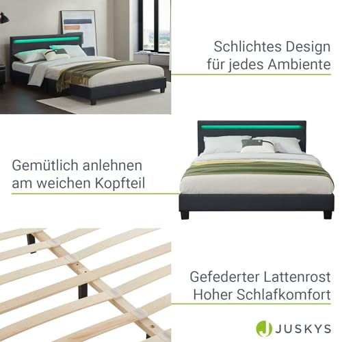 Juskys letto imbottito Paris da 140x200 cm con LED, materasso e rete a doghe - Rivestimento in similpelle e struttura in legno - Nero - Moderno e stabile - Letto singolo per ragazzi