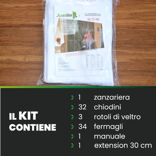 JustGo Zanzariera Magnetica Porta Finestra + Extension di 30 cm, Chiusura Automatica a Calamite, Istruzioni di Montaggio Chiare, Calamite Potenti, Bianco, 90 x 290 cm