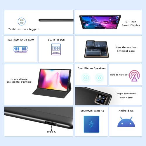 JUSYEA Tablet 10.1 Pollici Android 10.0 - RAM 4GB | ROM 64GB - WIFI -Octa core (Certificazione GMS Certified), Tablets, 6000mAh Batteria, Custodia di Alta Qualità(Nero)