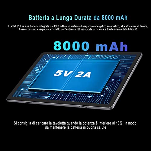 【Schermo da 10 pollici e batteria da 8000mAh】J10 utilizza uno schermo da 10 pollici 2.5D, che migliora efficacemente la sensibilità dello schermo e il comfort del tocco. È in grado di fornire colori chiari e ricchi in diversi ambienti e di filtrare la luce blu. Il tablet è dotato di fotocamere anteriori e posteriori da 5MP + 8MP, che consentono dieffettuare videochiamate con familiari, amici e colleghi. La batteria ad alta capacità da 8000 mAh fornisce una potenza di picco a