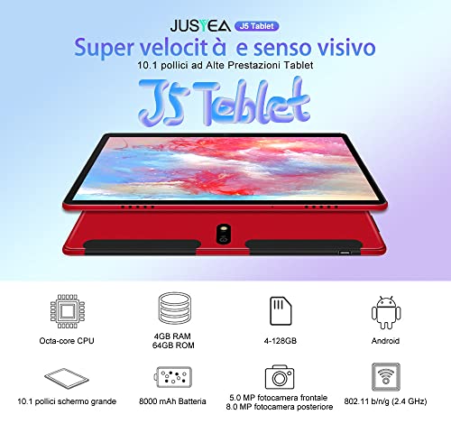 JUSYEA Tablet 10.1 pollici Android 9.0 Tablet ultra-portatile 4GB RAM 64GB ROM, 128 GB espandibili, Octa-Core 1.6 GHz processore, 8000mAh Batteria, 5 MP + 8 MP, Custodia protettiva WIFI-Rosso