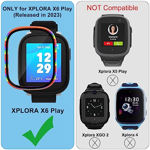 【Protezione Completa 360°】- La custodia protettiva per lo schermo è realizzata in PC di alta qualità + vetro temperato di durezza 9H, copre l'intera parte anteriore e i bordi curvi di Xplora X6 Play, protegge l'orologio dei tuoi bambini da graffi, cadute o urti accidentali. (**NOTA: La protezione dello schermo non assorbe l'umidità, utilizzare un panno asciutto per pulire se l'acqua, il sudore o l'umidità entrano nella custodia.**)