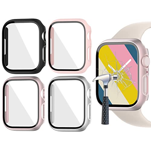 Jvchengxi [4 Pezzi Opaco Custodia 41mm per Apple Watch Series 9/8 / 7 Pellicola Protettiva, Rigida PC Vetro Temperato Cover Anti-Graffio Schermo Full Protezione (Nero/Argento/Oro Rosa/Rosa)