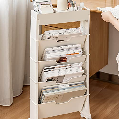 JYCRA Scaffale per Libri a 5 Livelli, Carrello Portaoggetti con Ruote, Organizer per Carta da Ufficio con Ruote, Scaffale Pieghevole e Scalabile per Libri, Scaffale per Libri sulla Scrivania(Beige)
