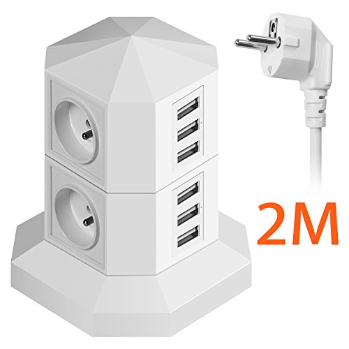 Jzbrain Torre multipresa verticale compatta parasurtenseur/parafulmine Blocco di 4 prese 230 V/13 A 2P + T e 6 porte USB 5 V/6 A