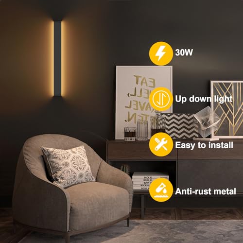 K-Bright 30W Lampada da Parete,IP 44 LED Applique da Parete con Stile Moderno Interni Lampada a Muro,4000K-45000K bianco naturale,32 pollici,2400 lumen,su giù il raggio di luce,Nero,Alluminio