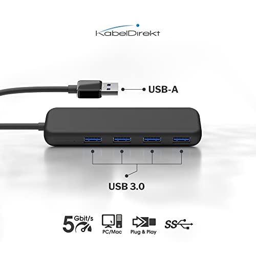 KabelDirekt - Hub a 4 porte USB-3.0 (design slim, Plug & Play su PC/portatile/Mac, 4 porte USB-A/1 connettore USB-A, per più connessioni USB, SuperSpeed/5 Gbit/s, nero)