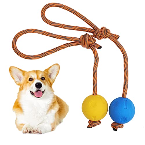 Kacouni 2 Pezzo Palla per Cani con Corda, Palla su una Corda Giocattolo per Cani, Palla di Gomma Solida Resistente ed Elastica per Afferrare, Lanciare e Tirare la Guerra (5 cm, Blu + Giallo)