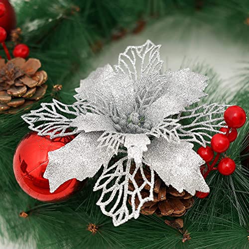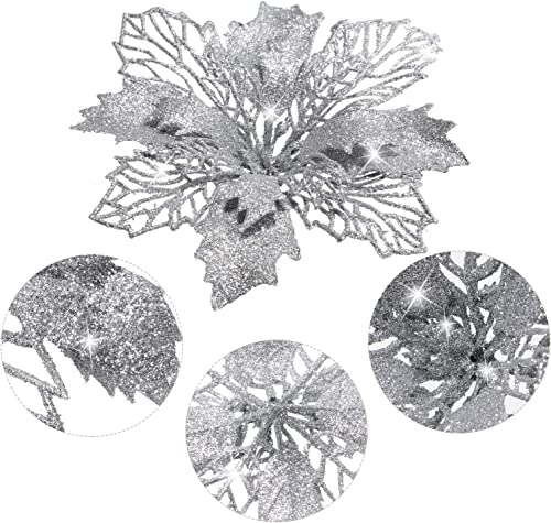 KAHEIGN 36 Pezzi Fiori di Poinsettia di Natale, Glitter D'argento Fiori Artificiali della Stella di Natale Addobbi per L'albero di Natale per Matrimonio Corona di Natale Festa a Casa Decoro (3 Taglia)