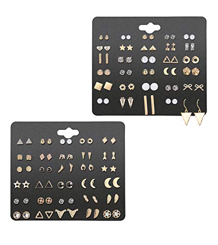 Kakonia 60 Paia di Orecchini a Bottone Tono Oro per Donna Uomo Triangolo Quadrato Cerchio Bar Stella Luna Geometrica Foglia Freccia Fiocco CZ Sfera Set di Orecchini di Perle Finte