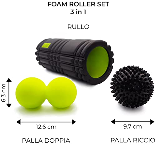 KALAHARI Foam Roller SET, 3 in 1 più Ebook esercizi in italiano - Rullo in schiuma, Palla Doppia, Riccio e comoda Borsa - Terapia Trigger Point e Massaggio Miofasciale