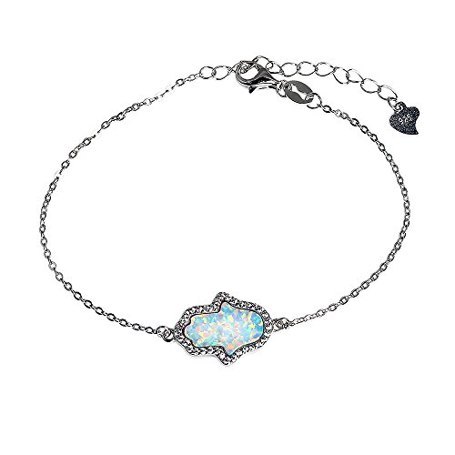 Kaletine, braccialetto in argento sterling con mano di Fatima, 12 x 9 mm, con opale artificiale e zircone cubico bianco, catena da 16,5 cm + 3,8 cm di estensione regolabile a 20,3 cm massimo