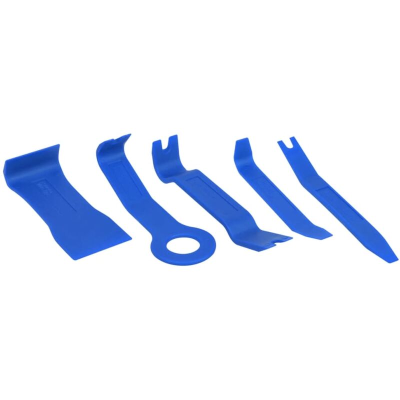 Il set di 5 strumenti per rifiniture e modanature 590153 della ProPlus consente di rimuovere facilmente finiture, modanature, pannelli delle portiere e cruscotti. Sono realizzati in nylon resistente agli urti. Il set funziona su finiture interne ed esterne. La consegna include: 1 dispositivo di rimozione del bordo largo 1 dispositivo di rimozione dei bordi stretti 1 dispositivo di rimozione a strappo 1 dispositivo di rimozione della maniglia 1 dispositivo di rimozione della clip per tappezzeria
