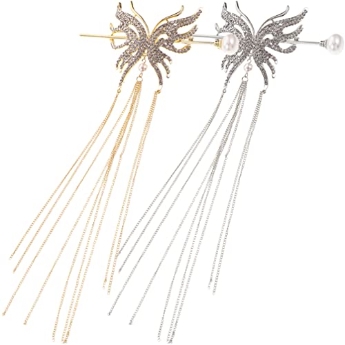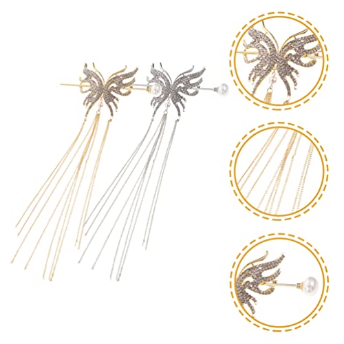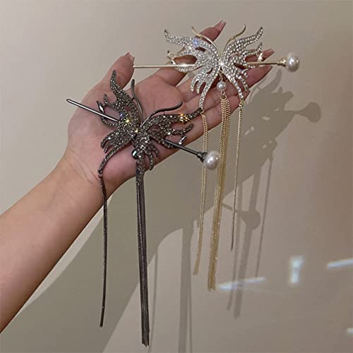 KALLORY Per Farfalla Con 2 Pezzi Bacchette Cinesi Strass Forcina Per Chignon Sposa Supporto Per Panino Per Le Ragazze Nastro Dorato