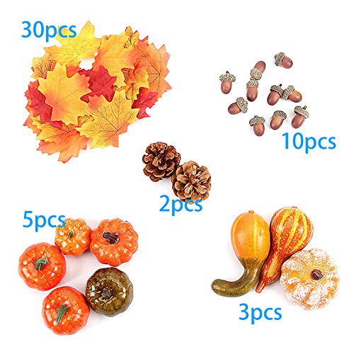 Il pacchetto include: 8 pezzi assortiti di zucche finte, 30 pezzi di foglie d'acero in diversi colori, 10 pezzi di pigne e 2 pezzi di ghiande, 50 pezzi in totale.