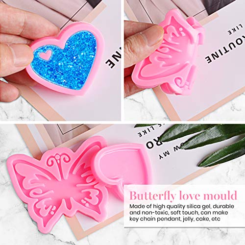 Kalolary 4 Pezzi Stampi per Resina 20 Pezzi Portachiavi con Catena, La Farfalla Cuore Portachiavi Fatto a Mano Stampo con Foro Stampo Portachiavi per Torta