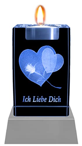 Kaltner - Portacandele con cristallo laser 3D, con cuore e rosa, frase in tedesco "Ich liebe dich"