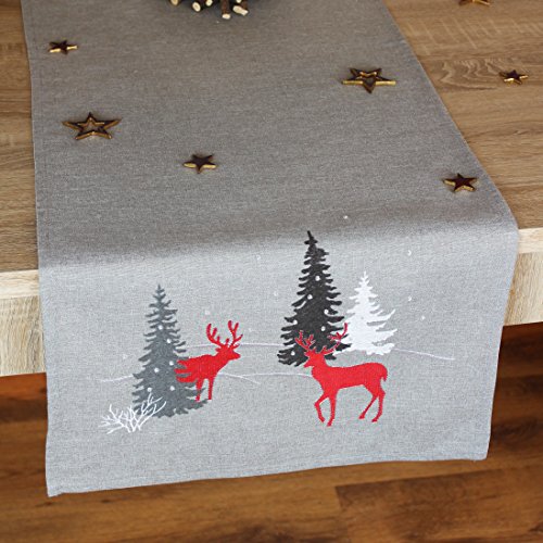 Kamaca Serie moderna cervo nella foresta in grigio chiaro con magiche renne e alberi di Natale in rosso antracite e crema decorato - un vero gioiello - Inverno Avvento Natale, Fibra sintetica, Hellgrau Grau Weiss Rot, Tischläufer 40x110 cm