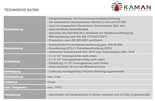 Kaman Smart Equipments, scaldasalviette con attacco centrale, colore antracite/bianco, lunghezza / larghezza / colore a scelta, qualità premium con garanzia di rimborso - (600 x 1200 mm, bianco)