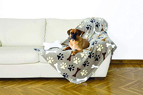 Ecco un'idea regalo per Bau, una morbida coperta in microfibra lavabile abbinata ad un morbido cuscino-peluche a forma di osso con fantasia ispirata al mondo dei cani.