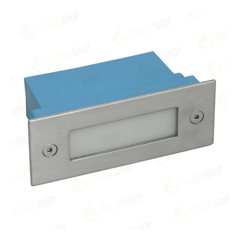 Lampada da incasso segnapasso taxi 230v rettangolare 0,60 watt cromo satinato bianco naturale alimentazione 220-240 volt grado di protezione IP54 struttura in metallo paralume di vetro utilizzato per illuminare ad esempi i gradini di una scala gradazione luce 4000k lumen 10 altezza 44 mm larghezza 50 mm lunghezza 110 mm