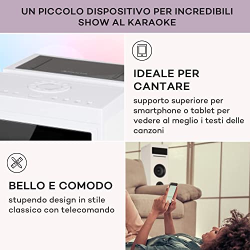 MUSICA SENZA LIMITI: Collega il tuo smartphone o smart device via Bluetooth, via Aux o attraverso una porta USB. Tante soluzioni per riprodurre i tuoi pezzi favoriti dalla cassa karaoke con microfoni wireless e telecomando per una notte da dj.
