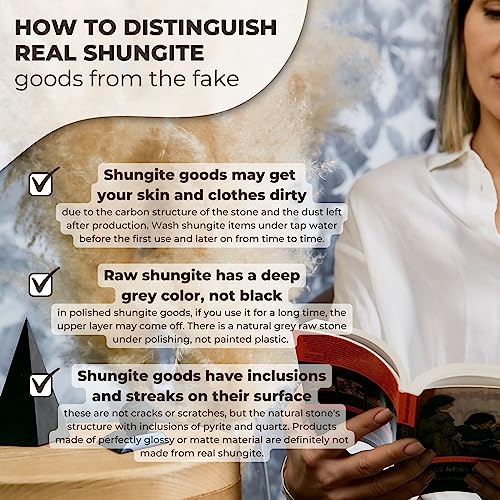 Autentico Le nostre piramidi di shungite sono fatte di vere pietre di shungite estratte dal deposito di Zazhoginsky in Carelia, l'unico deposito al mondo in cui viene estratto un minerale così straordinario. Siamo specializzati in shungite dal 2015. I residui neri e le striature dorate sulla superficie sono normali e sicuri e sono un segno di autenticità.