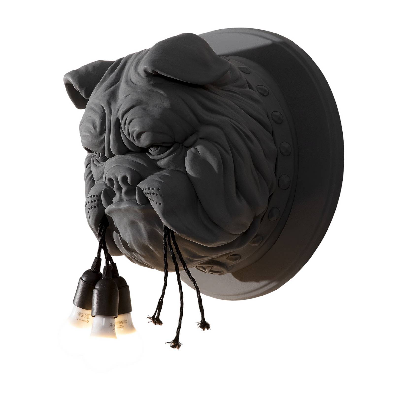 Un design molto originale - applique Amsterdam con il plastico di un bulldog Il designer Matteo Ugolini ha ideato questa applique, un autentico colpo d'occhio. Da una piastra rotonda fissata sul soffitto sporge la testa in ceramica di un minaccioso bulldog che tiene in bocca tre cavi con portalampada E27. La bestia sembra aver dato sfogo alla sua voglia di distruggere strappando i cavi. La luce però rimane lo stesso. I tre attacchi sono previsti per lampadine E27. Si suggerisce di scegliere lampadine LED di plastica. L'applique Amsterdam è un esempio di creatività, artigianato ed espressività che caratterizzano i prodotti dell'azienda italiana Karman.
