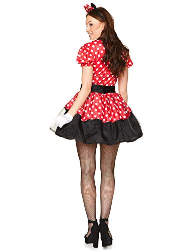 Include abito a pois rosso, bianco e nero, cintura nera, fascia e guanti bianchi