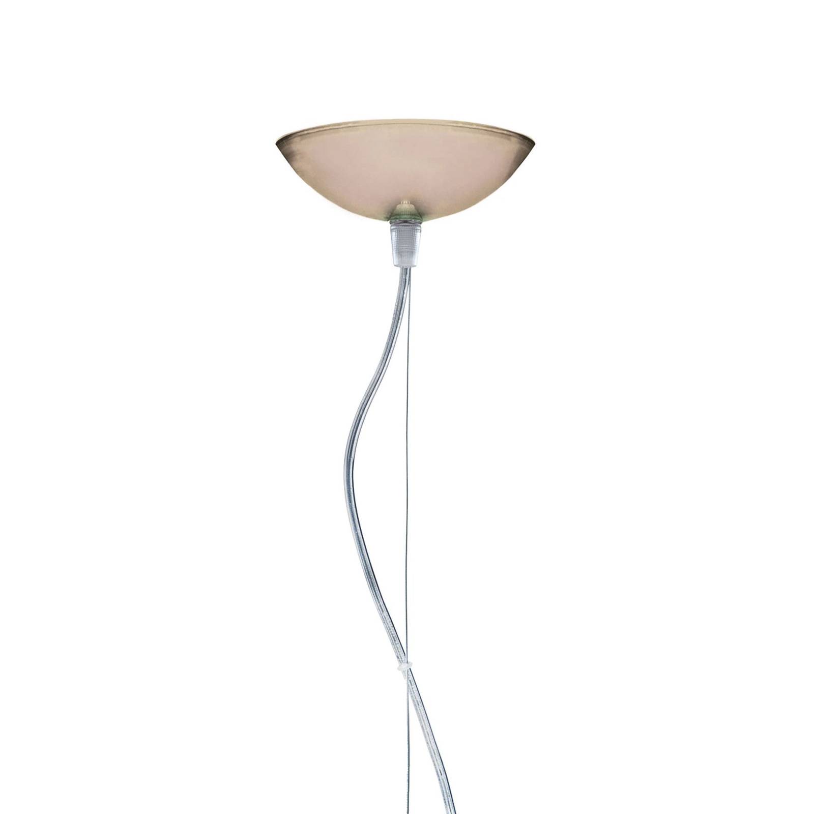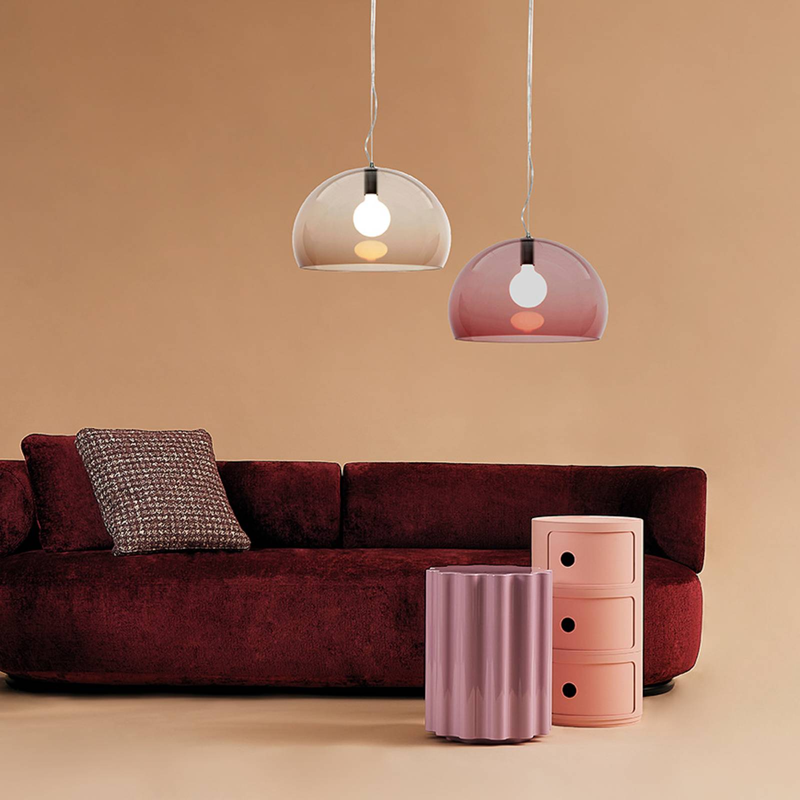 Lampada a sospensione di design italiano FL/Y in look bolla di sapone Con la lampada a sospensione FL/Y, l'architetto e designer italiano Ferruccio Laviani ha progettato una sorgente luminosa che affascina con le sue linee sottili. Il paralume non è un emisfero perfetto, ma il piano secante si trova al di sotto del diametro, in modo da catturare meglio la luce. In particolare, la trasparenza del paralume e la forma morbida fanno sembrare FL/Y una grande bolla di sapone.Una lampada E27 con luce bianca calda e una potenza di 15 W LED è già inclusa nella consegna. La luce bianca calda è accogliente e crea un'atmosfera familiare, ideale per i soggiorni. Grazie al paralume trasparente, l'apparecchio è perfettamente adatto anche all'uso di lampade decorative a filamento e retrofit. Il paralume è costituito da una plastica trasparente, termoplastica e riciclata, colorata con un processo discontinuo. La lampada è realizzata e prodotta dall'azienda italiana di illuminazione Kartell. Il produttore di apparecchi di illuminazione è noto per i suoi apparecchi in plastica, che hanno già ricevuto numerosi riconoscimenti. Tuttavia, l'azienda si è anche posta l'obiettivo di lavorare in modo ecologico durante la produzione. Pertanto, vengono utilizzati solo materiali rigenerabili e che non hanno un impatto negativo sull'ambiente.